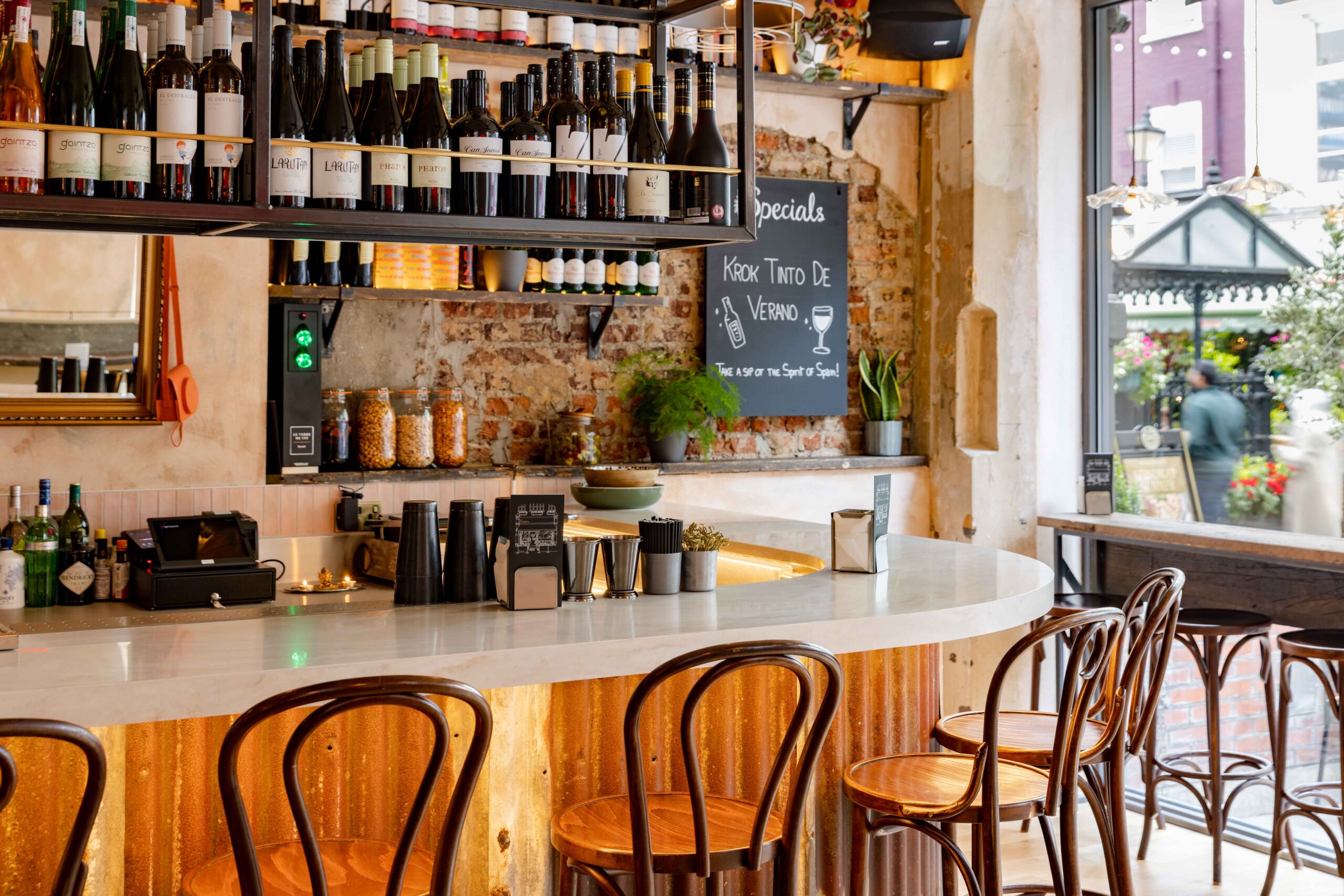In harmony with the aspirations of founders of Brindisa Tapas Kitchens, the new site brings the Spanish flair with regional sensibilities. Spanish music and lively, bustling atmosphere draws guests into an authentic bar culture. This site also features a terrace resembling a Northern Spanish plaza, providing gorgeous outdoor seating. The interiors for this contemporary bar and restaurant feature natural and reclaimed materials used throughout the bar and restaurant, with muted tones of wood and an old-world feel. With glass doors opening out onto the terrace to resemble a Northern Spanish plaza, guests will be greeted by Bar Kroketa’s signature corrugated iron central bar front, lined with stools for counter drinking and dining. For a more immersive experience guests can choose to sit in the basement to enjoy the theatre of the open kitchen.