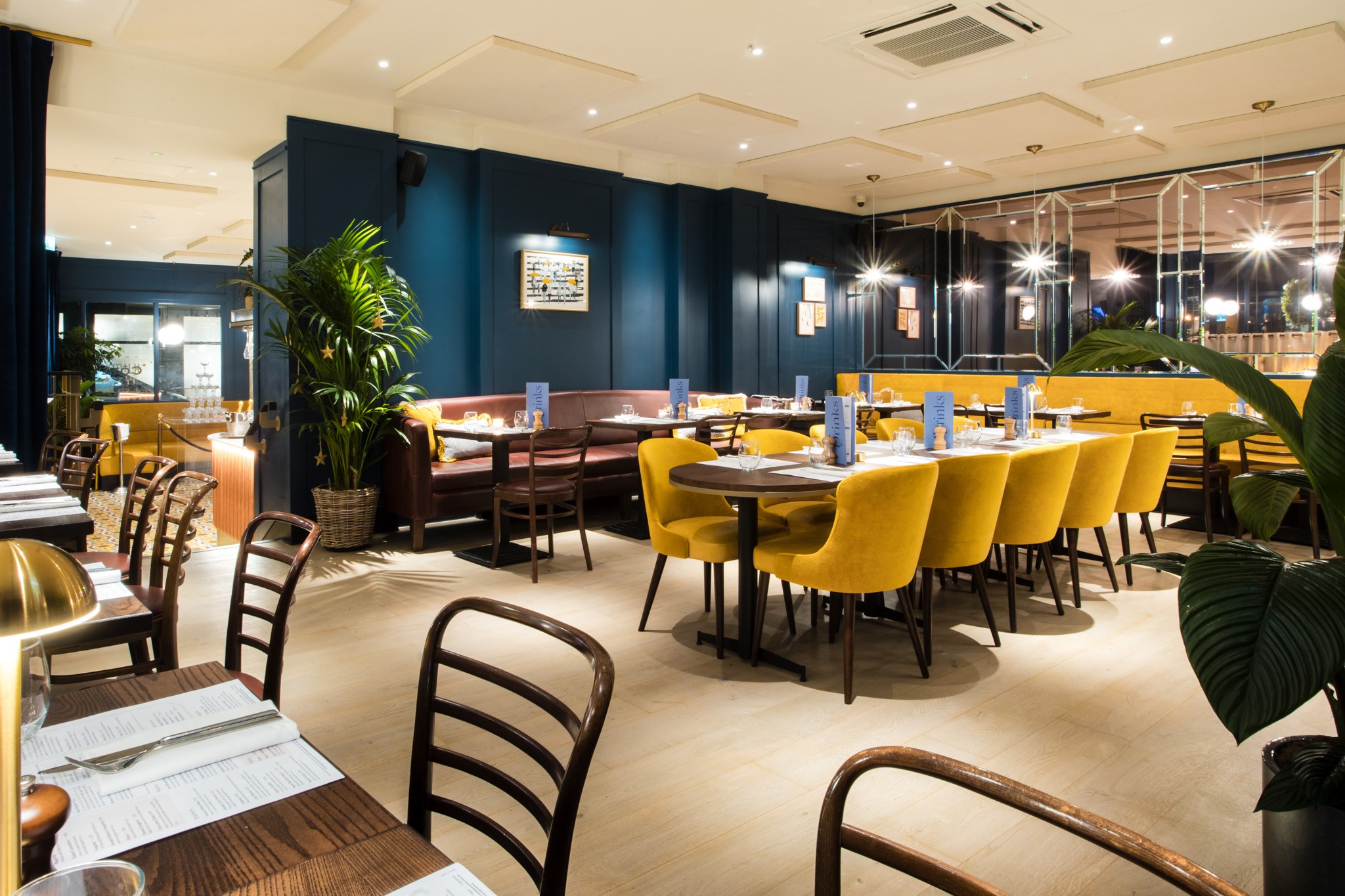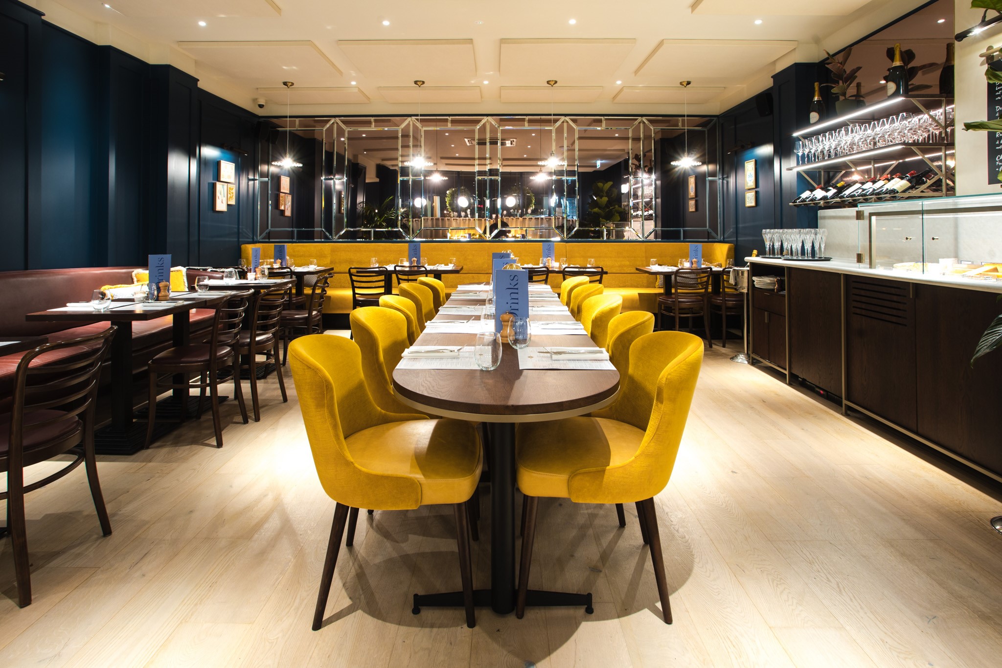 The focus for the design was around sharing, bringing people together to share great French cuisine and produce. A new dining bar, larger sharing format table layouts and a bespoke cheese counter have all become showcase features. To elevate the dining experience we used a mix of dark rich blues, vibrant mustard upholstery and patterned fabrics with new lighting, unique original artwork and planting schemes.