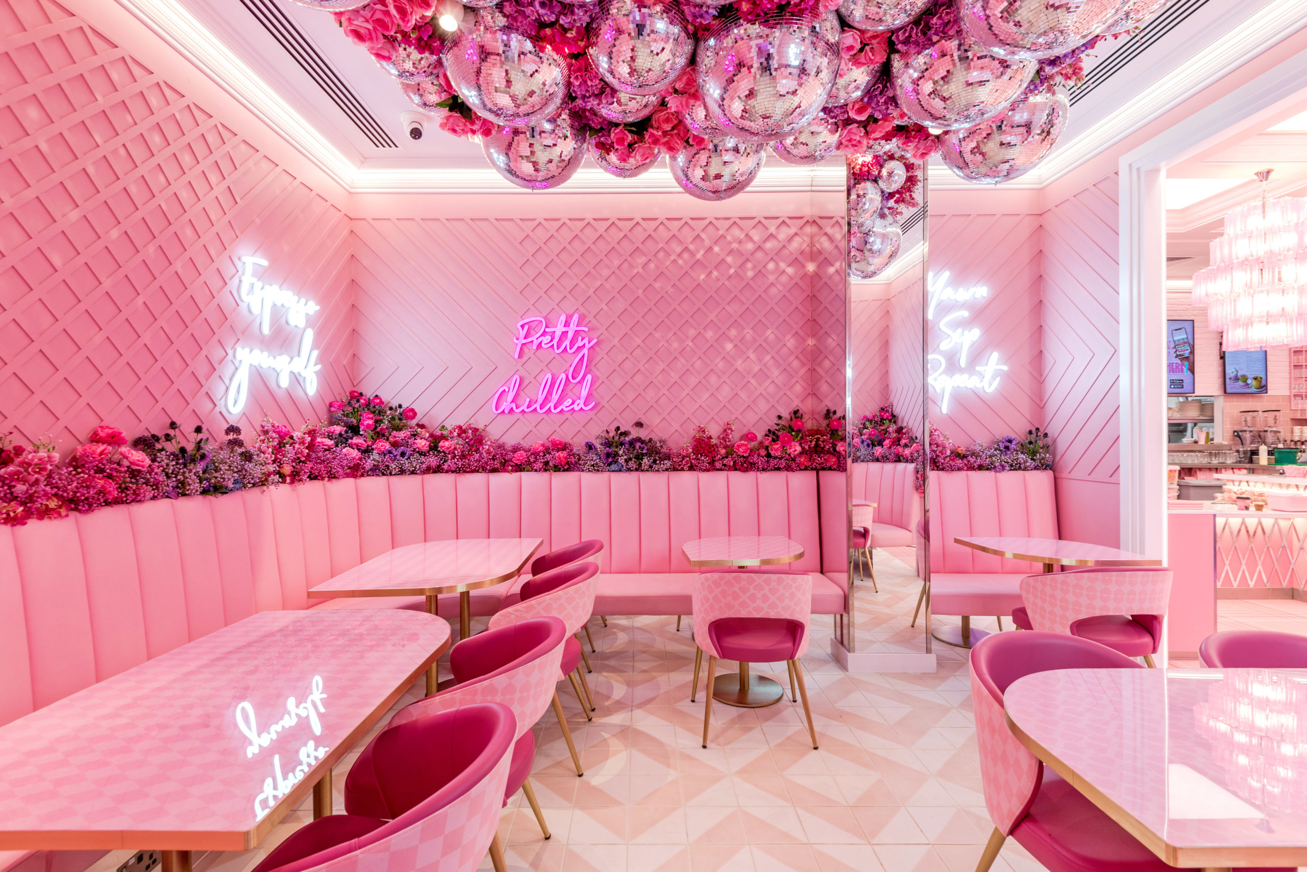 The clubhouse features a themed party room with EL&N branded pink pool tables, balls and cues. The bright neon piano in the middle of the Scottish cafe creates another great Instagram moment with the classic EL&N slogan neon signage and florals.