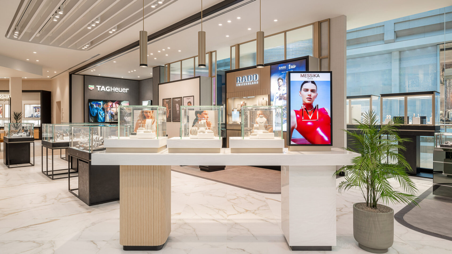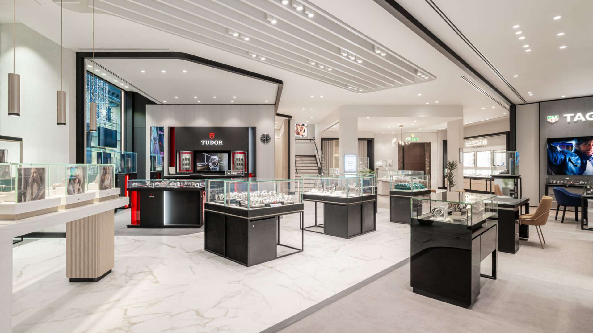 This is another large showroom for Goldsmiths in Bullring Birmingham, following an expansion and huge refurbishment. This new two storey showroom now spans across 3 units on the corner of Bullring. The ground floor features seven dedicated brand areas, including Rolex, Cartier, Tudor and TAG Heuer. Goldsmiths Jewellery also has areas across the ground and first floor.