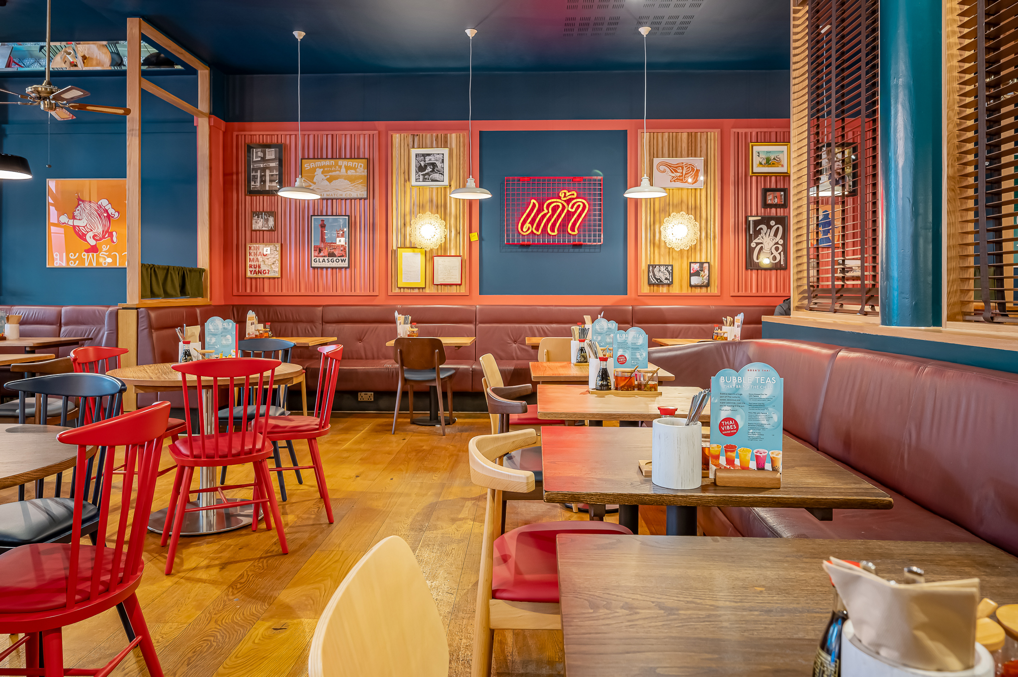 As with the other Rosa’s restaurants, it was so important to inject the brand story, surrounding customers with their brand heritage. We used fun, bright artwork throughout including Thai inspired signage and photo frames.