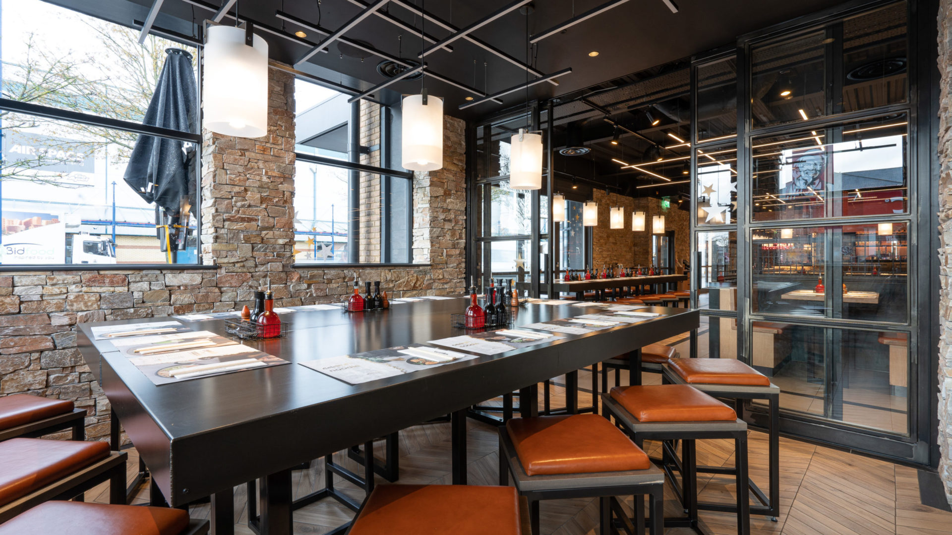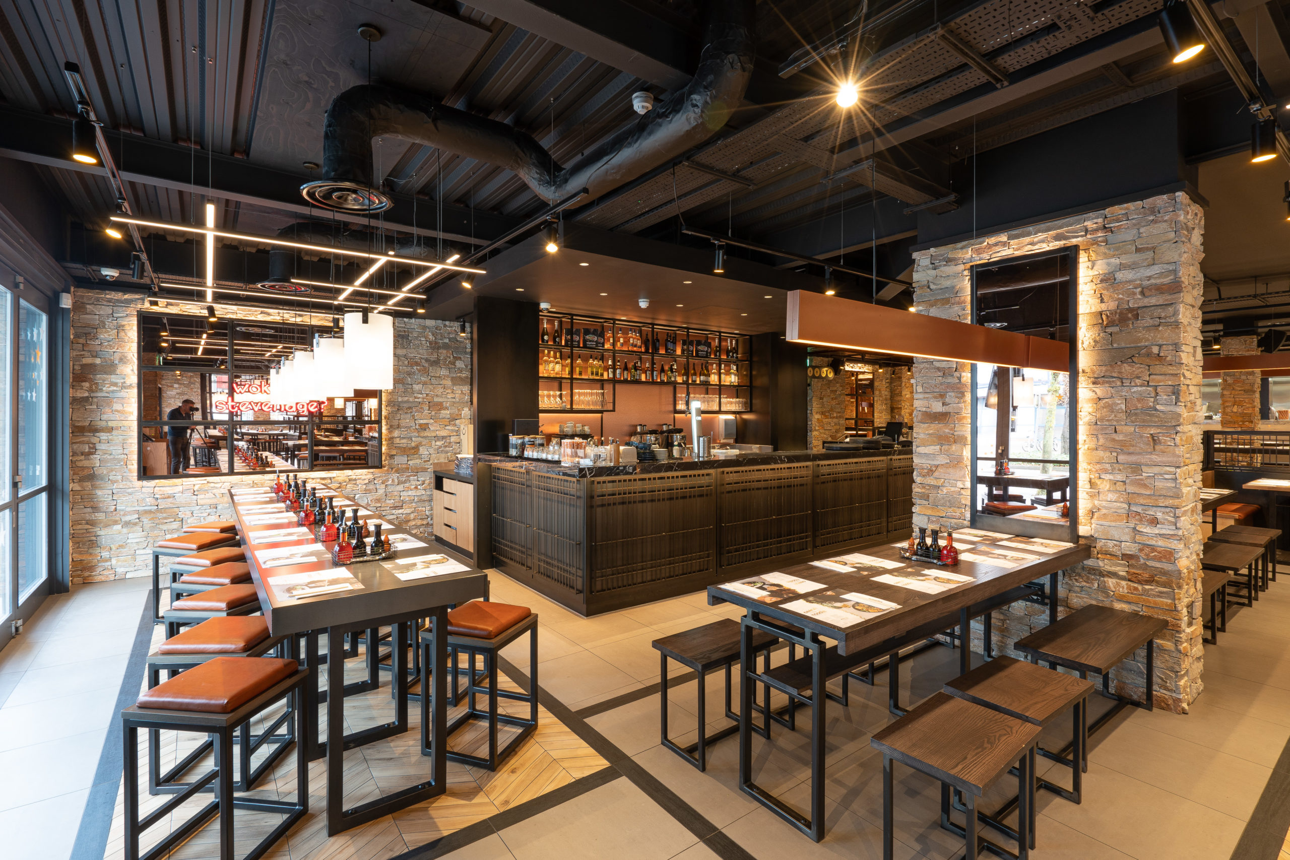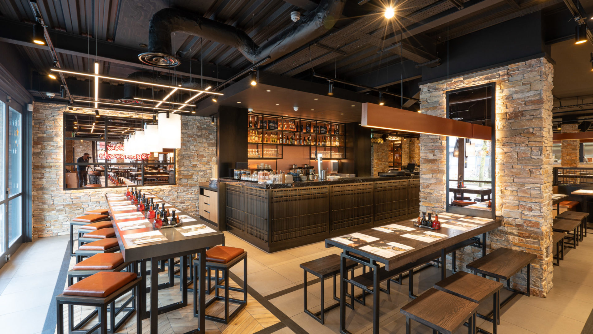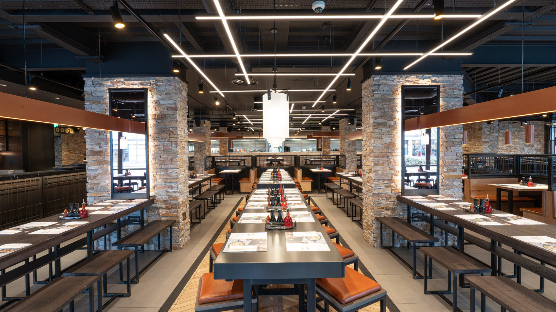 Wagamama believes in the ‘kaizen’ philosophy – constantly working to do good and be better. The large signs and digital screen outside give off a ‘Tokyo city centre’ vibe. Long tables and cosy booths line the walkway down to the kitchen pass, where freshly-made dishes appear like magic. Eagle-eyed diners can also spot copper accents on the marble kitchen counters, to match the lighting troughs over their heads. The rest of the interior’s finished with both timber and timber-effect tiles for a warm atmosphere, plus laser-cut screens and glazed panels for added privacy.