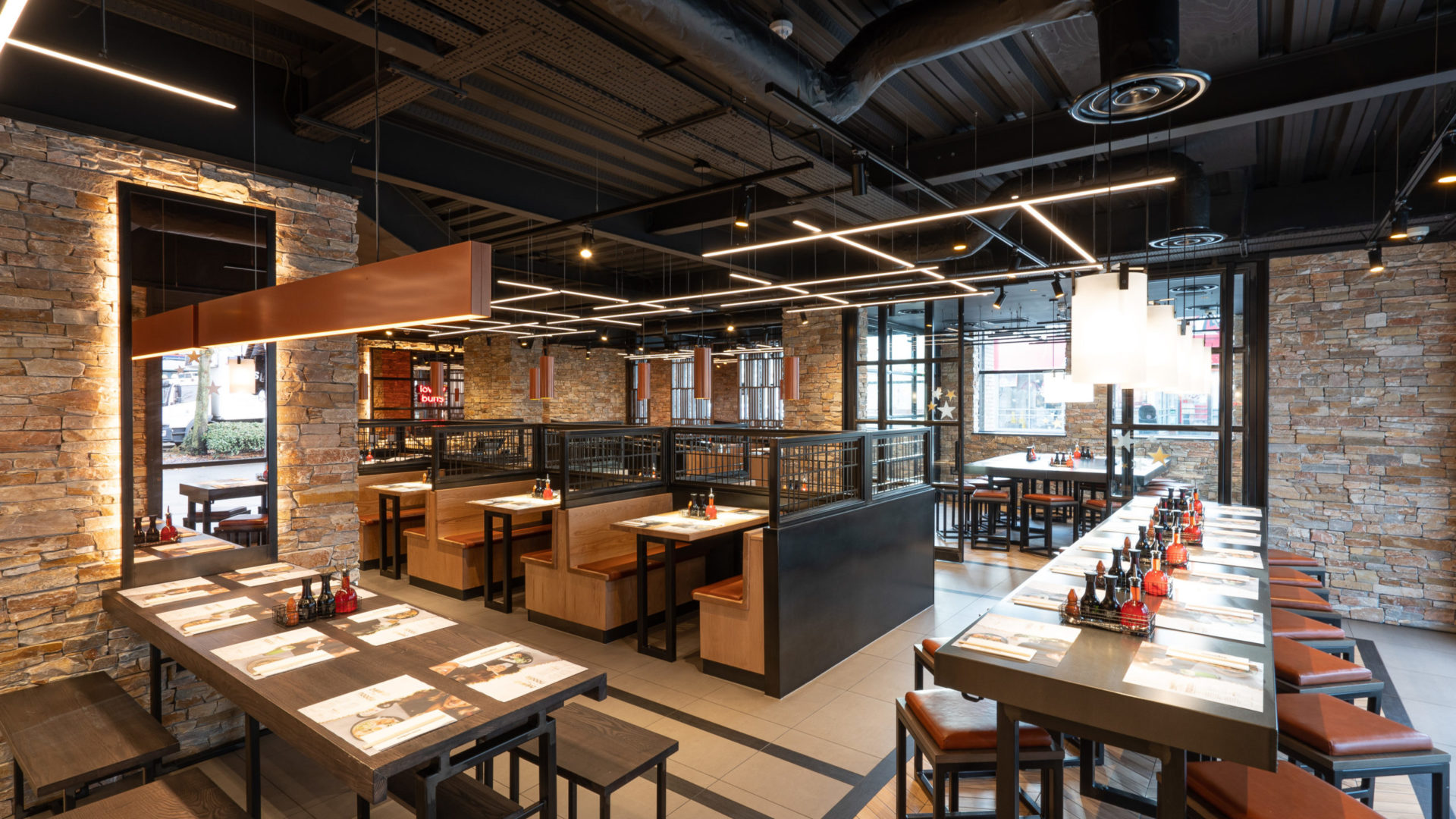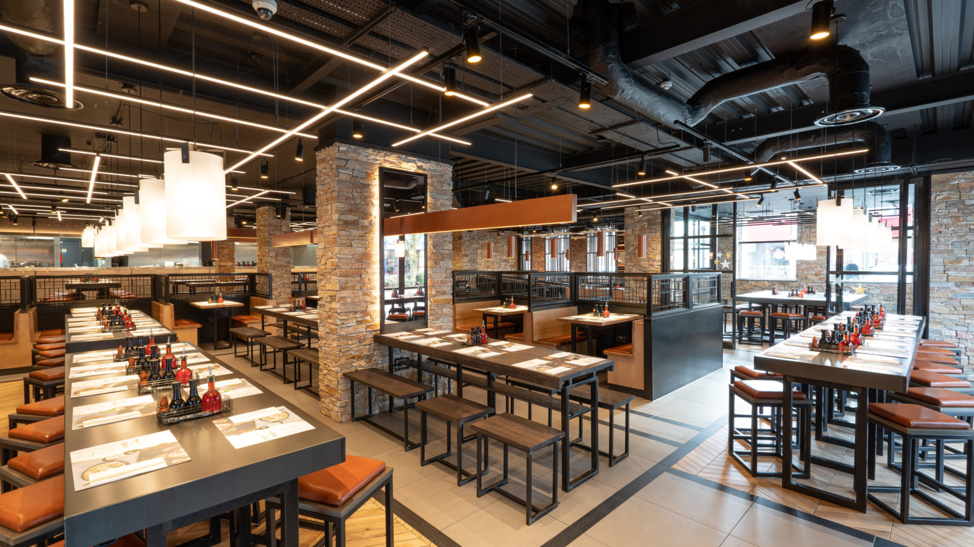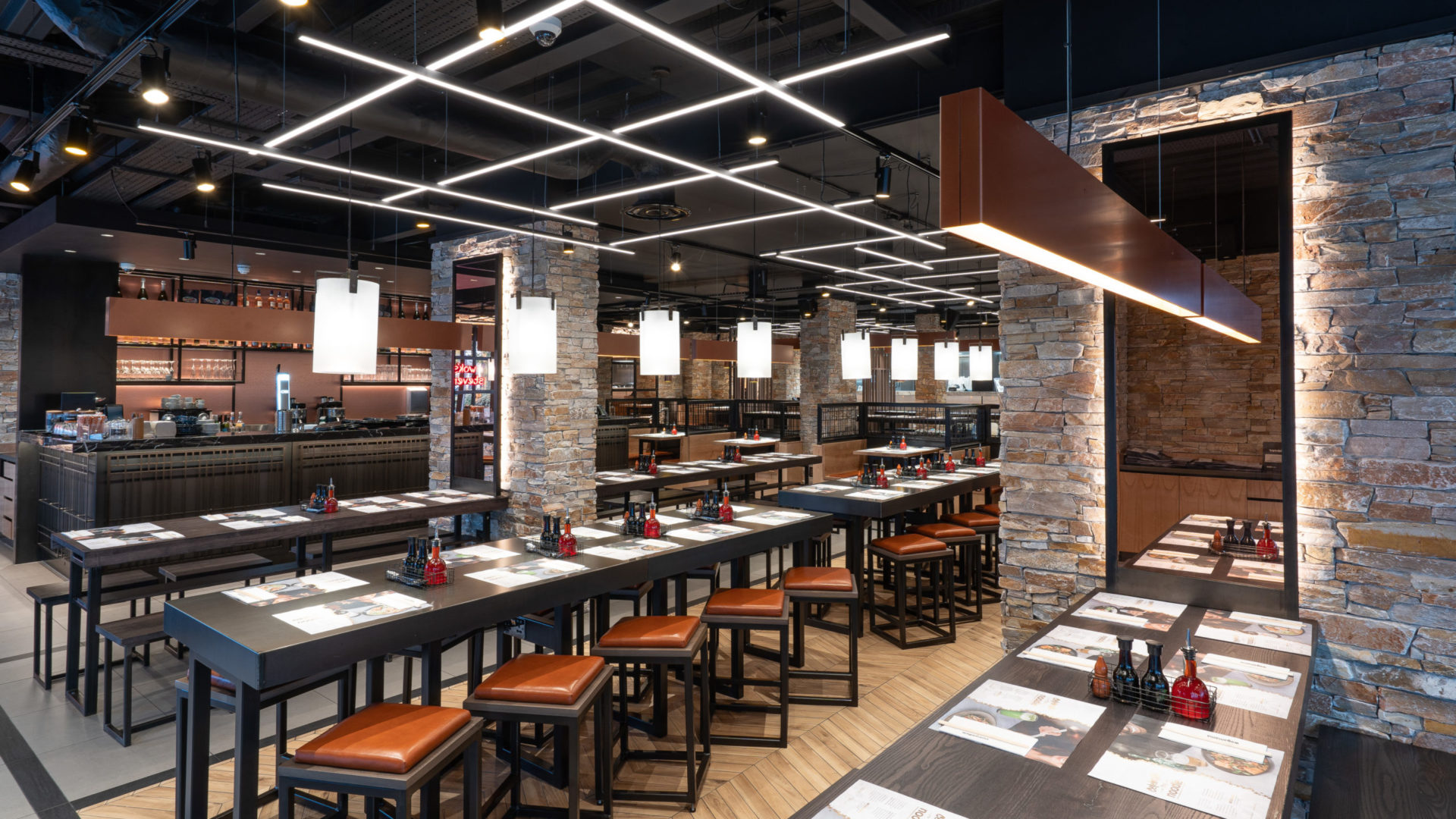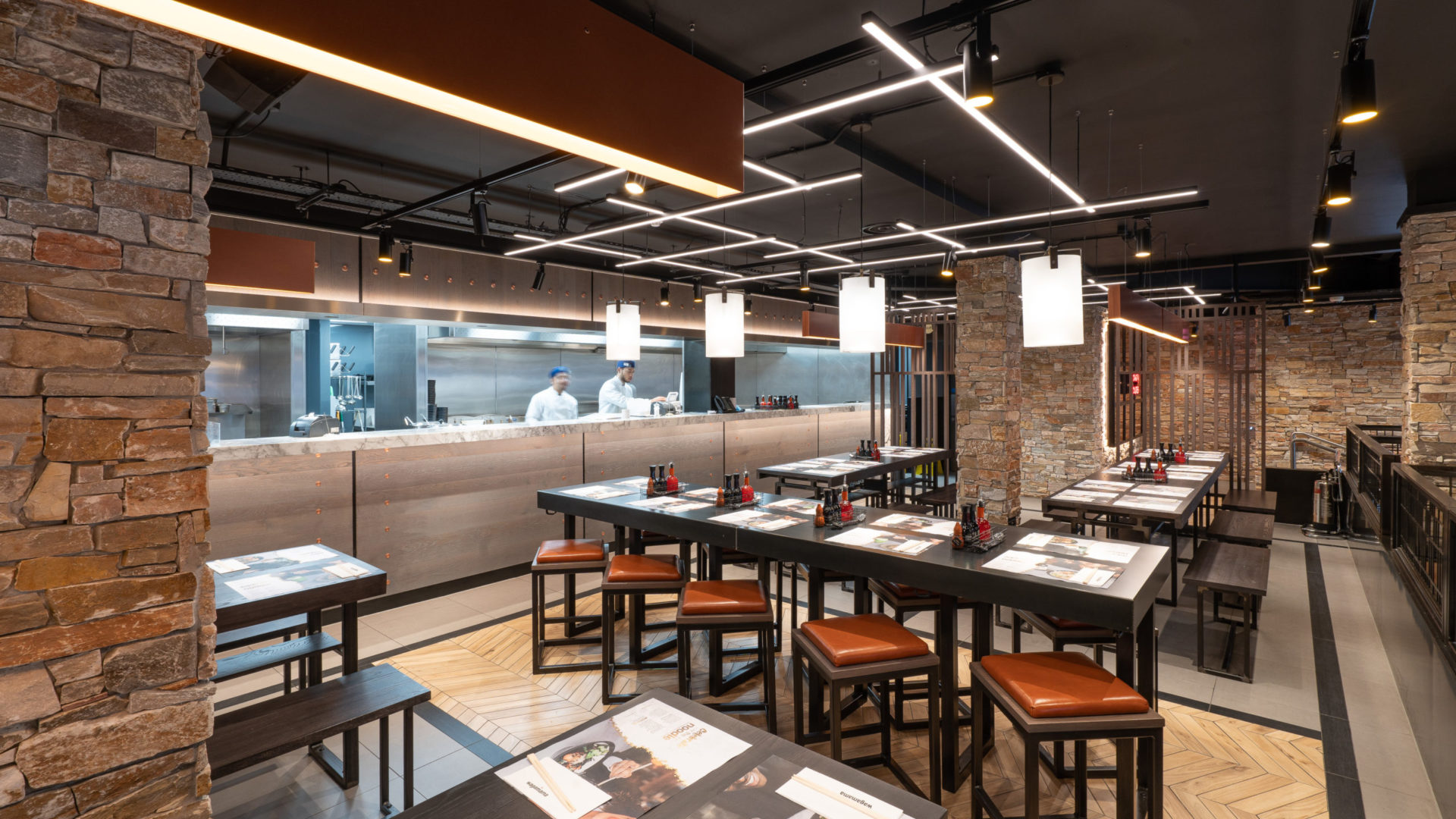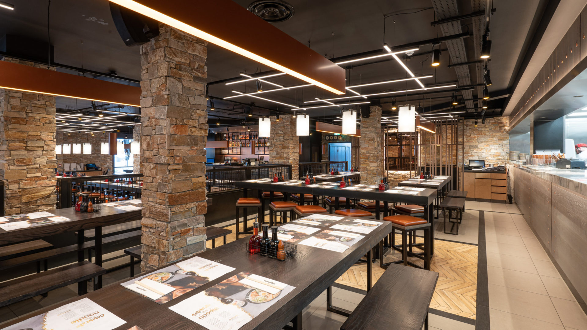 Wagamama believes in the ‘kaizen’ philosophy – constantly working to do good and be better. The large signs and digital screen outside give off a ‘Tokyo city centre’ vibe. Long tables and cosy booths line the walkway down to the kitchen pass, where freshly-made dishes appear like magic. Eagle-eyed diners can also spot copper accents on the marble kitchen counters, to match the lighting troughs over their heads. The rest of the interior’s finished with both timber and timber-effect tiles for a warm atmosphere, plus laser-cut screens and glazed panels for added privacy.